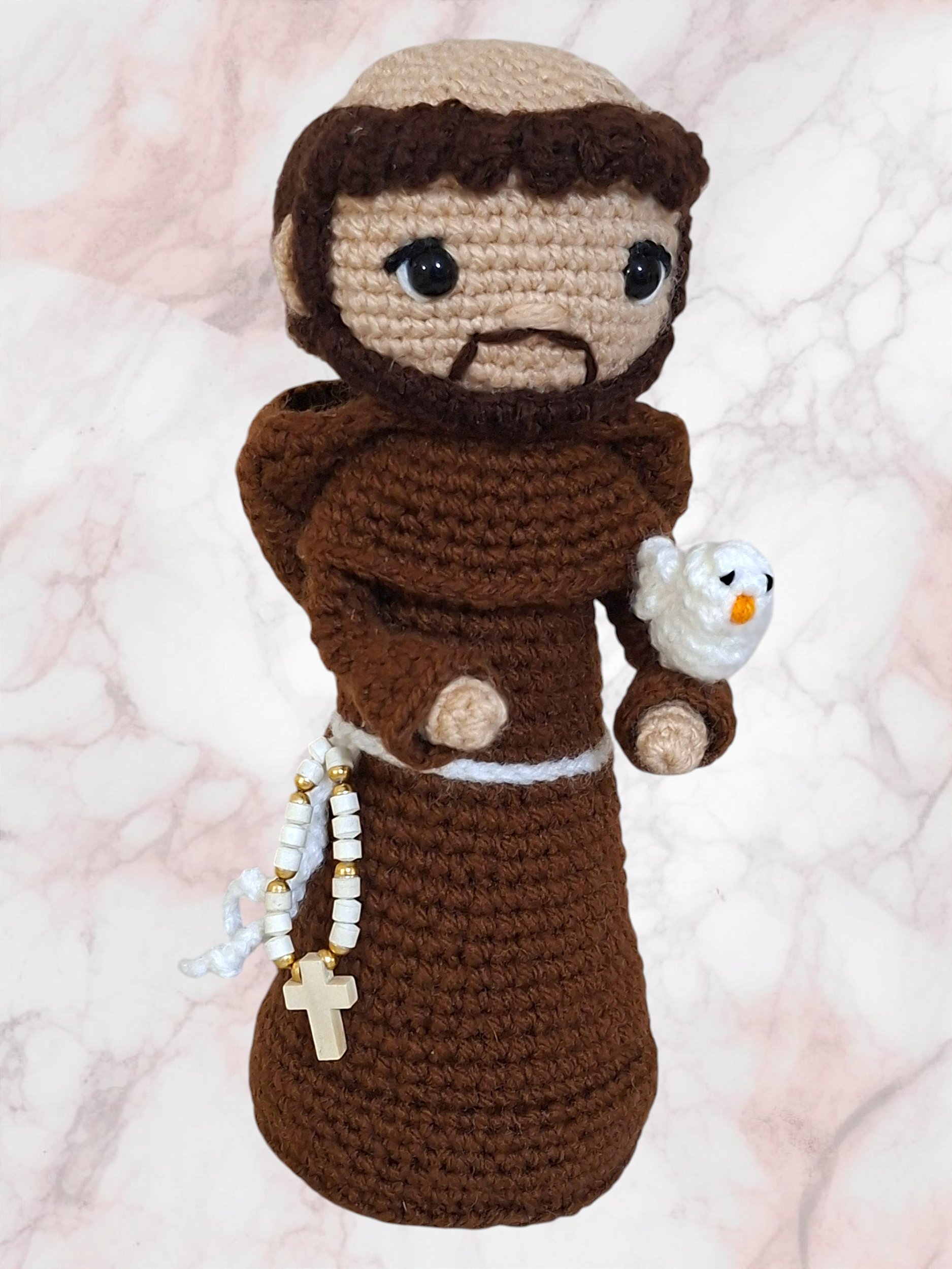 Encante-se com este delicado São Francisco em amigurumi, confeccionado artesanalmente com muito carinho e atenção aos detalhes. Inspirado no santo conhecido por seu amor aos animais e à natureza, essa peça transmite paz, fé e proteção.